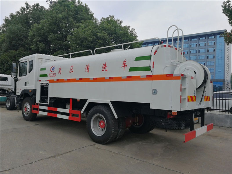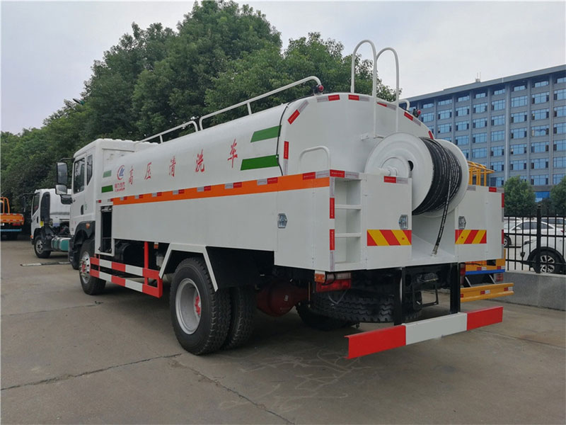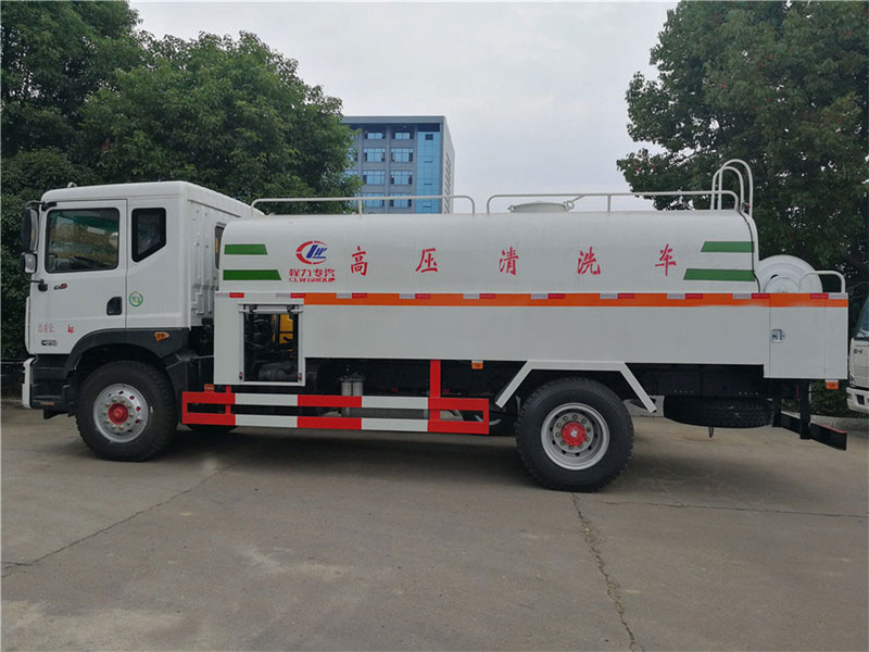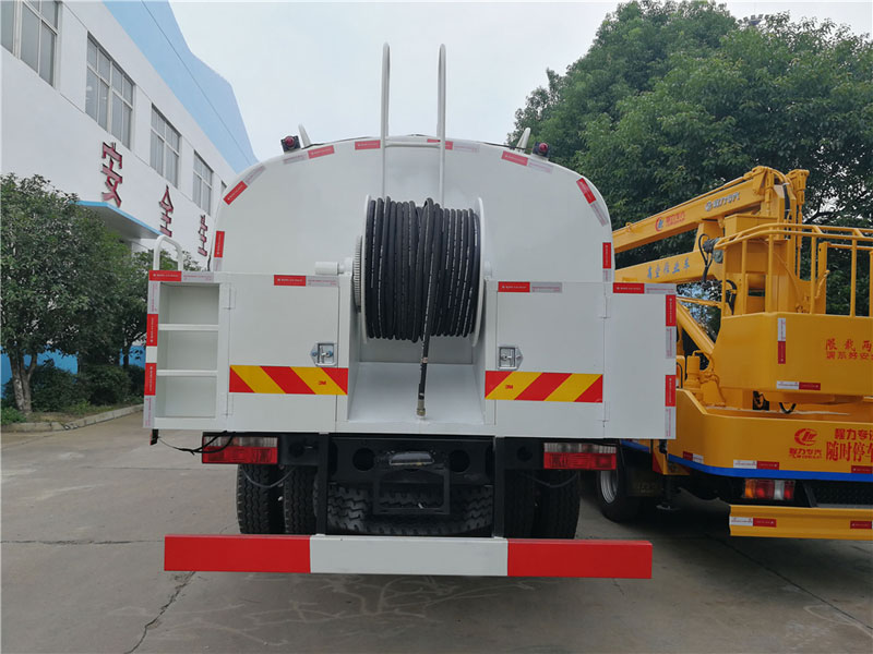 上装配置:罐体采用国标优质碳钢4mm制作,罐体有效容积为8-10立方。配备进口高压泵(高压泵压 力:16Mpa 、流量:130L/min ),夹心取力器,卷帘门,齿轮泵,高压三通,液压阀,带亮管,带液压卷盘,带φ19MM专用高压清洗管60米,带10个高压喷头,带消防接头,带警示灯。